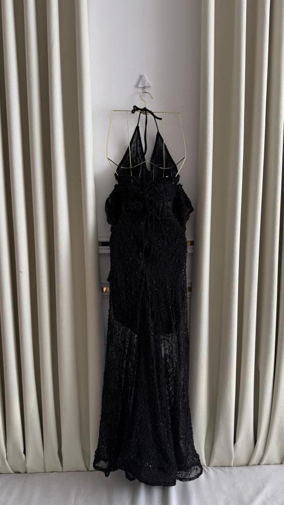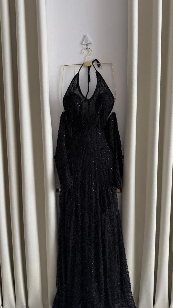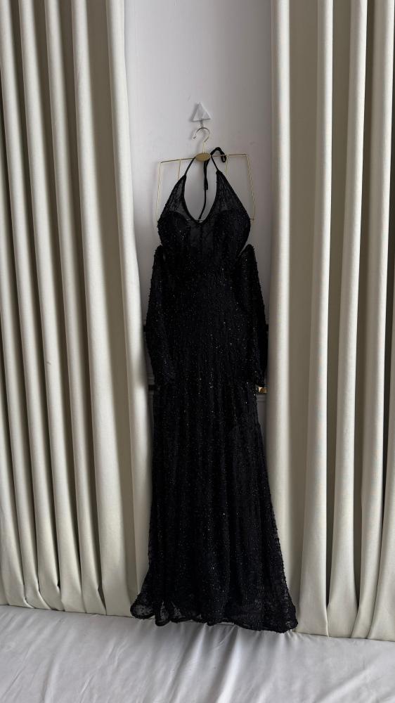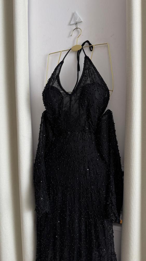 اللون والنسيج: الفستان أسود بالكامل، ومصنوع من قماش مزين بالترتر و الخرز البراق الذي يمنحه مظهرًا متلألئًا.