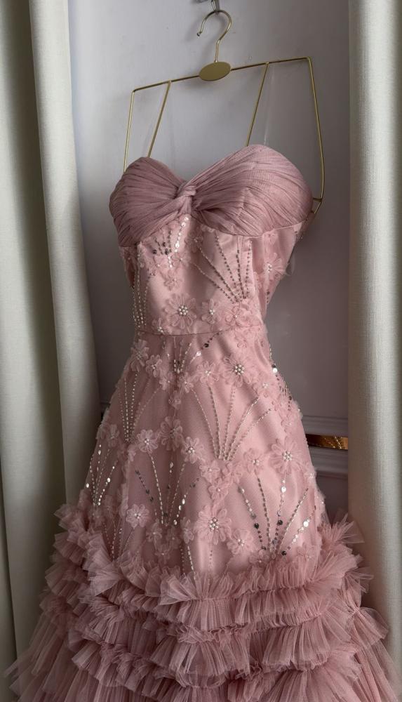 التصميم: يتميز الفستان بتصميم كلوش متعدد الطبقات في الجزء السفلي، يعطي حجمًا وحركة أنثوية. أما الجزء العلوي، فهو مزين بتطريز من الخرز واللؤلؤ البراق، مما يضيف لمسة من السحر والرقي.